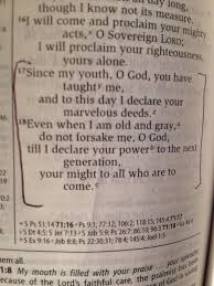 One of the reasons I used Psalm 71 as my title are the verses 17-18. “Since my youth, God, you have taught me, and to this day I declare your marvelous deeds. Even when I am old and gray, do not forsake me, my God, till I declare your power to the next generation, your mighty acts to all who are to come.”
