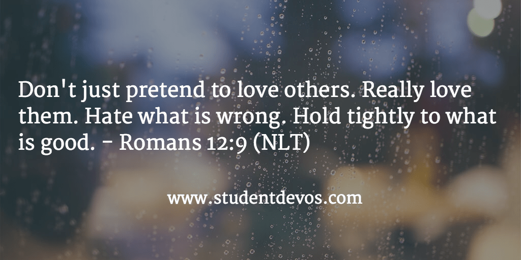 9 Don’t just pretend to love others. Really love them. Hate what is wrong. Hold tightly to what is good. 10 Love each other with genuine affection,[a] and take delight in honoring each other.11 Never be lazy, but work hard and serve the Lord enthusiastically.[b] 12 Rejoice in our confident hope. Be patient in trouble, and keep on praying. 13 When God’s people are in need, be ready to help them. Always be eager to practice hospitality.