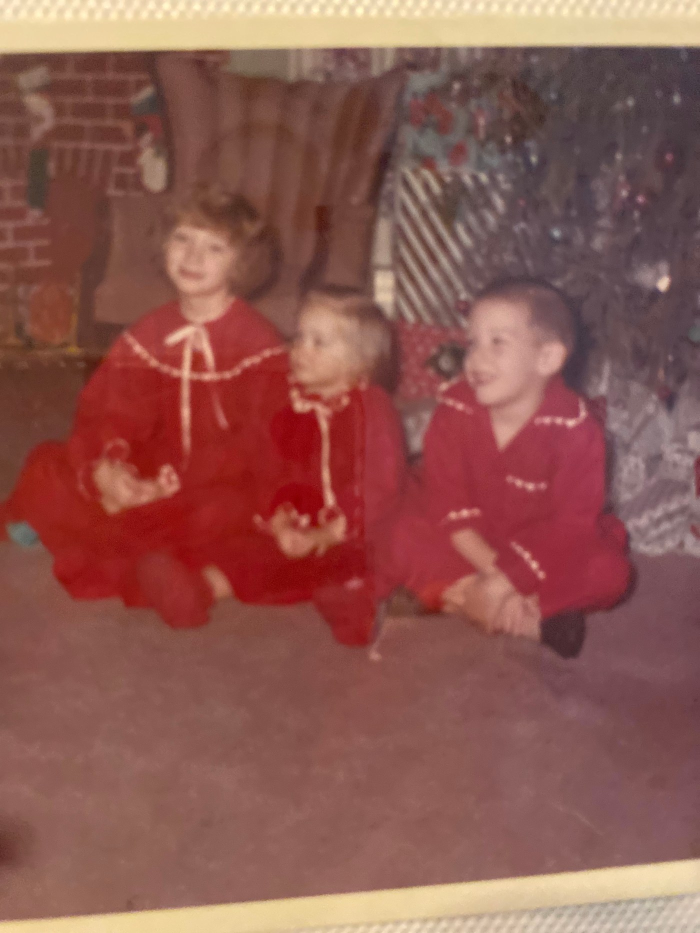 Feeling nostalgic today. Do we not look angelic? Sitting by the fireplace (fake brick), dressed alike, waiting patiently (not so much) for dear Santa.